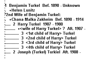 See below a "flat" text file - a branch of our Galician Turkl family. Syntax: First_name Middle_name /Family_name/ birth-death location1 > location2 +spouse *n__descendant (n denotes number of generation) [h] denotes a holocaust victim. R` Rabbi Dr. Doctor |