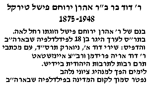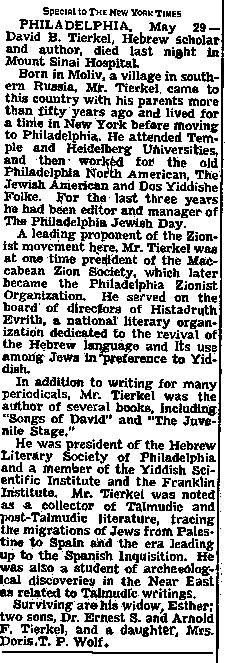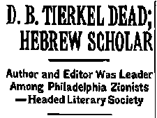 Collection: Title: Papers, 1890-1942. David Baer Tirkel used the pen-name D. Batten. He was active in Jewish organizations in Philadelphia, PA, and contributed to and edited Yiddish newspapers there. He was born in the Ukraine and came to the United States in 1893. Manuscripts of Tirkel's essays, articles, plays, writings on the history of the Yiddish theater in Philadelphia, and an autobiographical sketch. Also, correspondence, 1905-1942; photographs of Tirkel; and minutes, 1899, of the Hebrew Literary Society of Philadelphia, are included. Ref.: *.DOC file sent to me by Andrew Z. Tirkel, Australia |